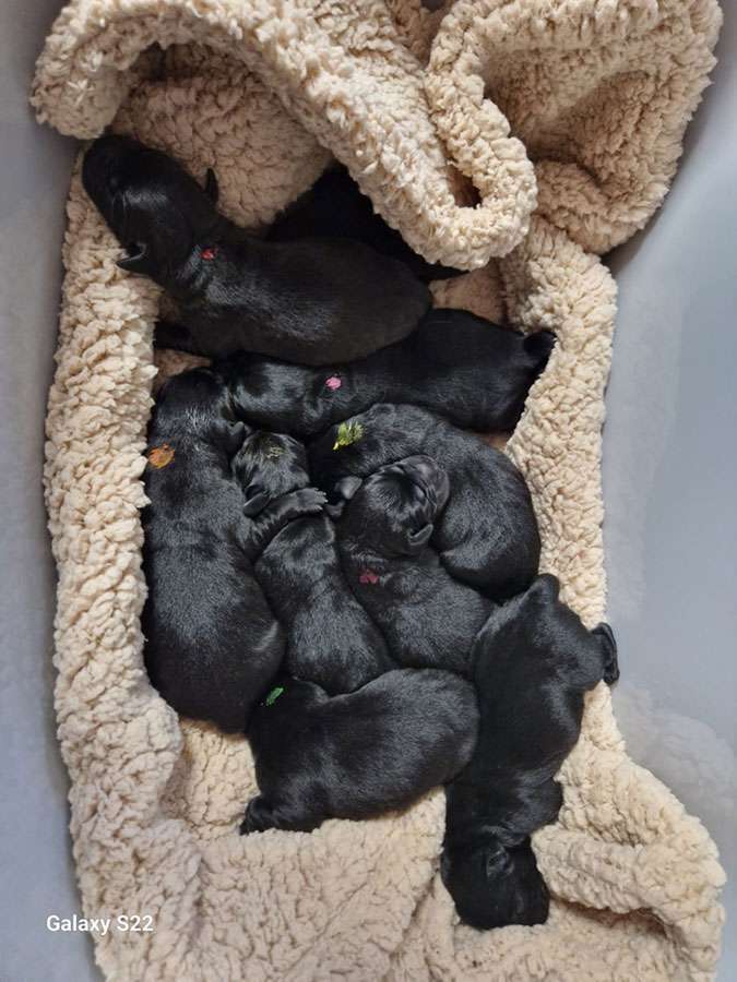 Charlie (Brooks Valley’s Laurel) hat im Zwinger Brooks Valley’s eine ganze Fußballmannschaft nach unserem Hank (Faithful Paw’s Heartbreaker) zur Welt gebracht. Es sind 6 schwarze Rüden und 5 schwarze Hündinnen. Wir wünschen den Züchtern eine schöne und aufregende Welpenzeit.