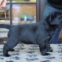 Lovely expression on this black. First class eye, shape and colour. Strong clean neck with well-placed shoullders. Good topline, length of rip. Well-angulated quarters. First class coat. Sound in movement. Well-balanced throughout.